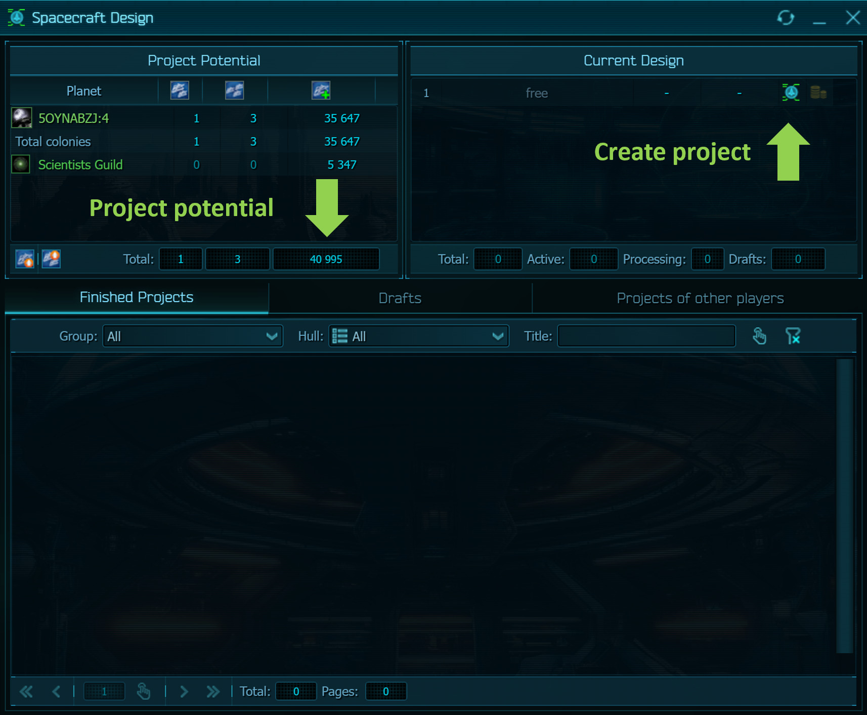 Finally, about science. Research is not limited by levels and does not require the consumption of materials. All that is needed are scientific buildings, modestly consuming energy, and loans for their maintenance. Buildings generate scientific potential and add the number of queues that contribute your empire. Research is not tied to the resources of a single planet, and this is a great advantage. The same is true for the design potential generated by the Construction Office, which is required for the spaceships’ design. The third potential is archaeological. It depends on the level of the planetary Archaeological Center in which a particular artifact is being researched.